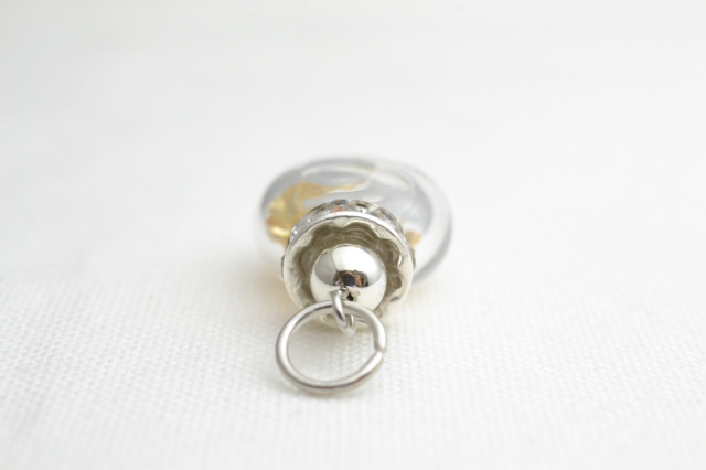 まるで香水瓶のような小瓶型のペンダントです。中のビーズがキラキラと輝く可愛らしいデザインです。お好みのネックレスを選んでください。