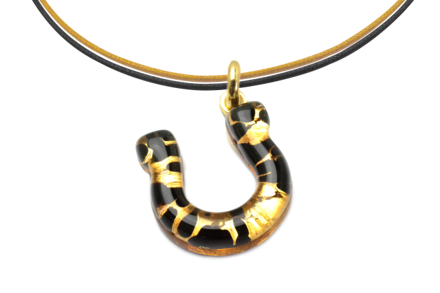 ベネチアングラスの馬蹄モチーフのペンダントトップです。ヨーロッパの古くからのラッキーアイテム!Uの字のところに幸運が溜まるといわれています。ゴールドやシルバーをガラスで挟んだ大人気のデザインです。ネックレスのタイプやカラーを自由に選んでいただけます。