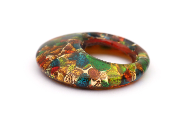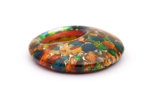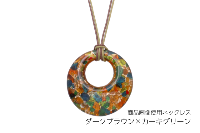 ベネチアングラスのドーナツ型のペンダントトップです! おおぶりの存在感のあるデザインです。ゴールドやシルバーをガラスで挟んでます。金属を使っていないのでアレルギーも安心です。ネックレスのカラーは組合わせ自由ですのでお好みのカラーを探してください。